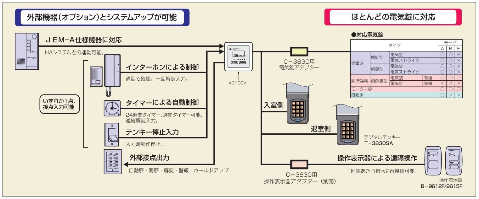 ・コントローラーからデジタルテンキー/電気錠/操作表示器までの配線は2線式無極性です。 ・管理方法に応じた3つのモード※が選べます。 ・動作状態をわかりやすいアイコンで表示します。 ・インターホンやHAシステム(JEM−A仕様)に対応します。 ・4桁8種類の暗証番号は液晶画面と設定ボタンで登録します。 ・コントローラーには電気錠アダプターを付属しています。操作表示器には専用の操作表示器アダプターを使用します。