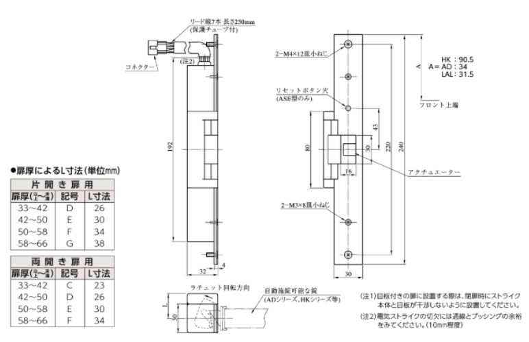 ・ケース深さ(mm):32モノロック)・LAL(レバーハンドル錠) ・扉厚可能範囲(mm以上∼mm未満):33∼42・42∼50・50∼58・58∼66