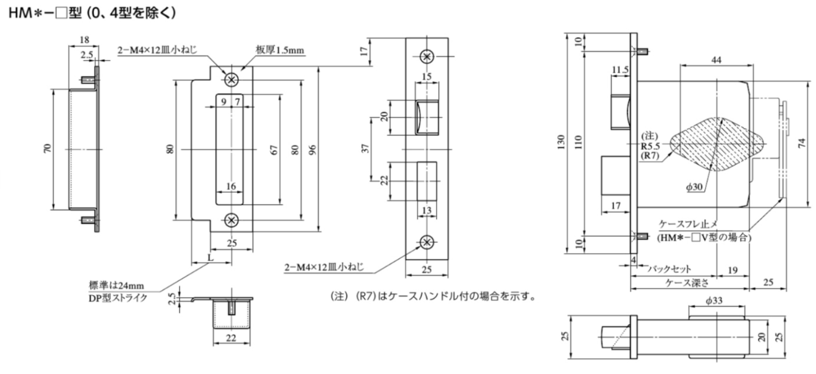 ・仕様バックセット(mm):51・64・76・100・127(注)76以上は振れ止めが付けられます。 ・扉厚可能範囲 (mm以上〜mm未満):33〜42・42〜50・50〜58・58〜66HMSシリーズ:25〜29・29〜33HM*ー8型:33〜42・42〜50 (注)HM*ー0型のバックセット127mmの設定はありません。