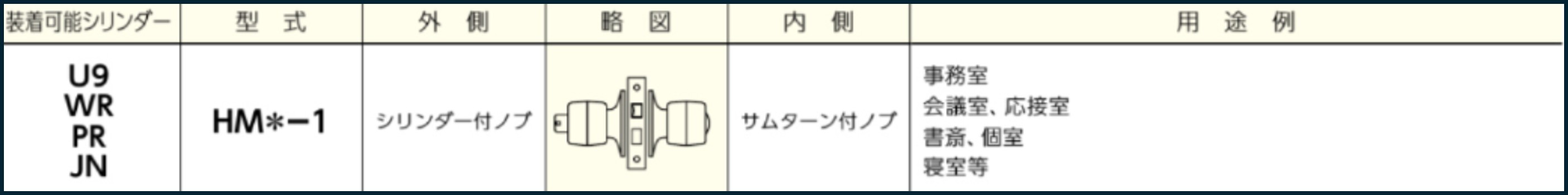 ・仕様バックセット(mm):51・64・76・100・127(注)76以上は振れ止めが付けられます。 ・扉厚可能範囲 (mm以上〜mm未満):33〜42・42〜50・50〜58・58〜66HMSシリーズ:25〜29・29〜33HM*ー8型:33〜42・42〜50 (注)HM*ー0型のバックセット127mmの設定はありません。 ・外側:シリンダー付ノブ ・内側:サムターン付ノブ ・用途例:事務室会議室、応接室書斎、個室寝室等