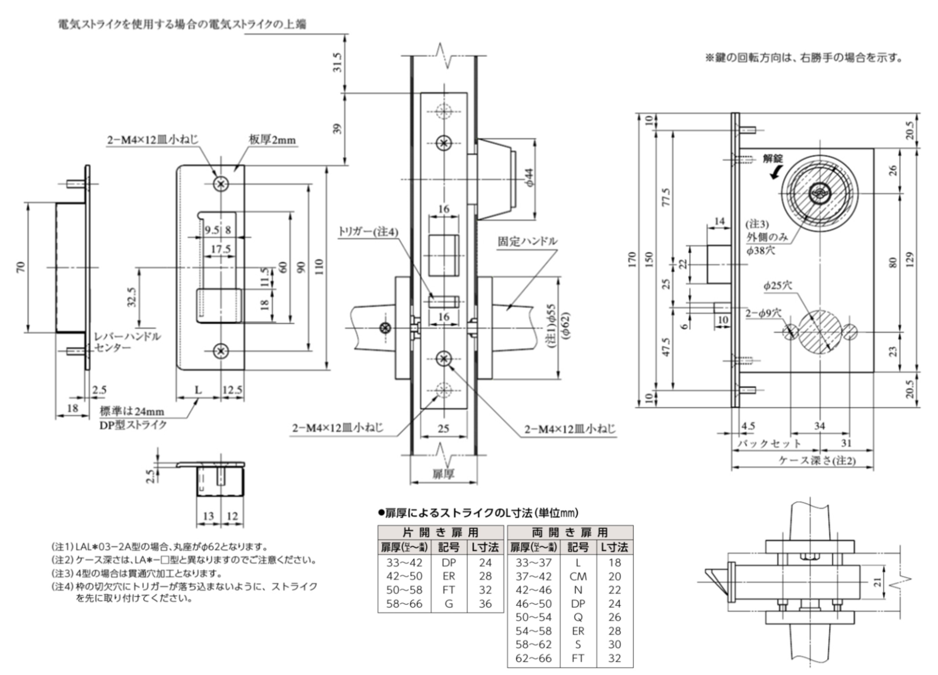 ・仕様バックセット(mm)51・64 ・スペーシング(mm)80 ・扉厚可能範囲(mm以上〜mm未満)33〜42・42〜50・50〜58・58〜66 ・有効チリ寸法(mm)6以内 (注)29型は枠に当たる場合がありますのでバックセット64mmのケースでご使用ください。