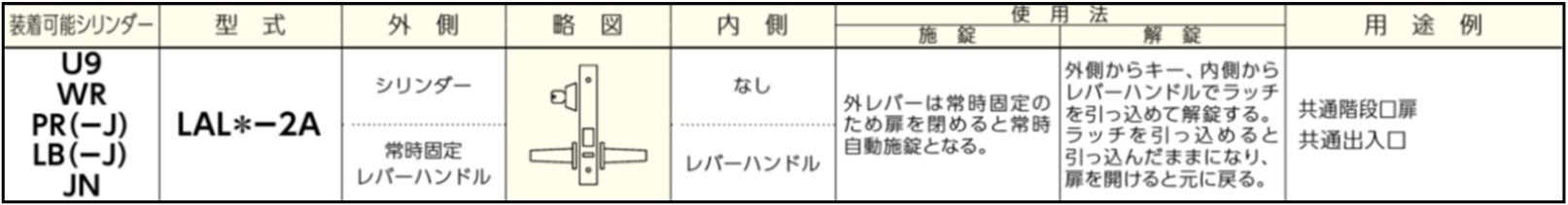 ・装着可能シリンダー:U9,WR,PR(-J),LB(-J),JN ・型式:LAL*-2A ・外側:シリンダー,常時固定レバーハンドル ・内側:なし,レバーハンドル ・使用法: ■施錠:外レバーは常時固定のため扉を閉めると常時自動施錠となる ■解錠:外側からキー、内側からレバーハンドルでラッチを引っ込めて解錠。ラッチを引っ込めると引っ込んだままになり、扉を開けると元に戻る ・用途例;共通階段口扉,共通出入口