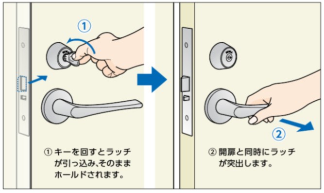 ・シングルスロー方式の自動施錠です。電気ストライクと組み合わせてご使用になれます。 ・外側のレバーハンドルは常時固定なので扉を閉めると常時自動施錠となります。 ・外側からはキーでラッチを引っ込めて解錠します。 ・内側からは、常時ハンドル操作のみで解錠できます。 ・片手で操作できます。キーでラッチを引っ込めるとラッチは引っ込んだままの状態になり、扉を開けるとラッチが戻るというラッチホールドリリース機能がありますので、片手で扉を解錠開扉できます。