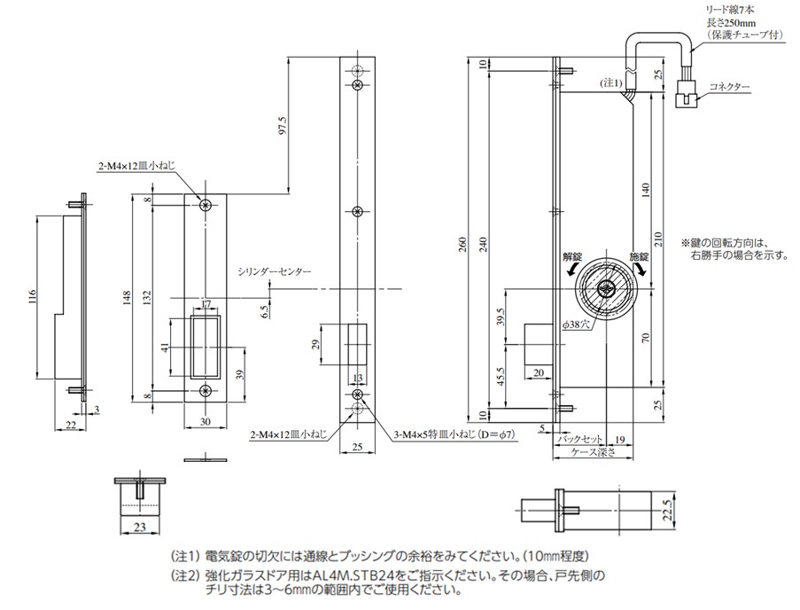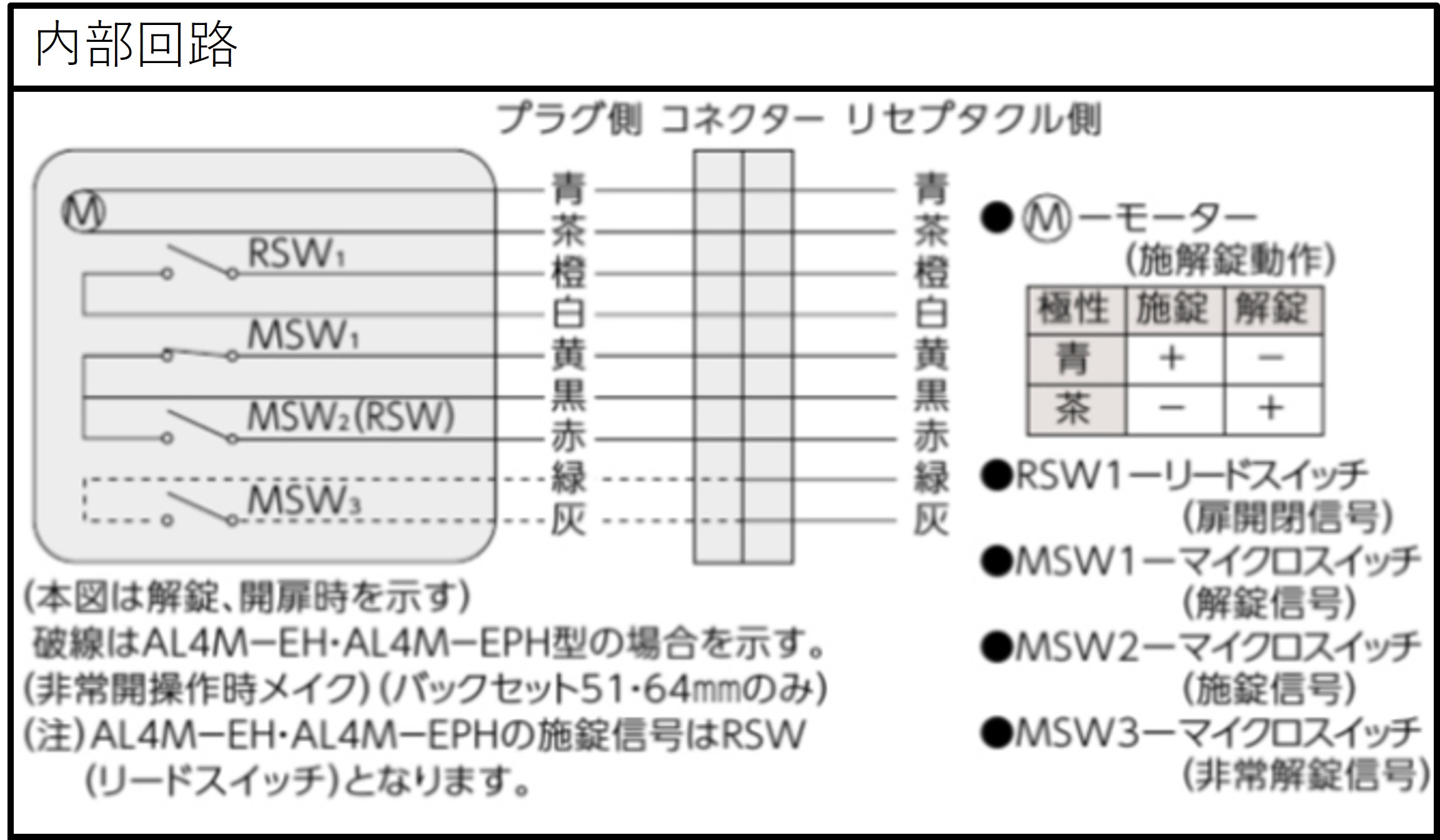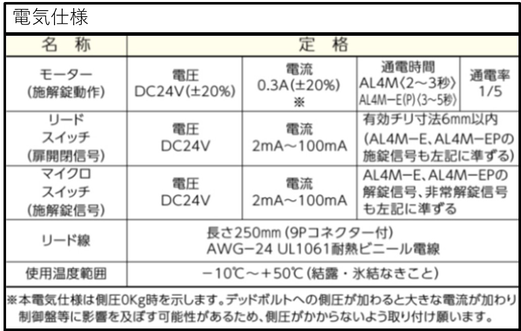 ■通電によりモーターを動かして施錠または解錠します。 ・側圧5kg以下でご使用ください。 ・通電する極性により、施錠または解錠します。 ■キーまたはサムターンで施解錠できます。 扉の構造やハンドル形状の関係で錠ケースを戸先下部に取り付けるなどサムターン操作がしづらくなる場合は、 スイッチを併用し電気的に解錠することをおすすめします。 ■電気錠の施解錠および扉の開閉の状態を電気的に確認できます。(無電圧接点出力) ■停電時は停電前の状態のままです。 停電中はキーまたはサムターンで施解錠操作が可能です。 ■非常開装置付のAL4MーE型、ワンタッチ非常開装置付のAL4MーEP型もあります。(バックセット51、64mmのみ) ・左右勝手がありますのでご注意ください。 ・AL4MーEP型にはLBシリンダーは装着できませんのでご注意ください。 ・AL4MーEおよびAL4MーEP型は非常カバーの再利用が可能です。非常カバーが割れるタイプのAL4MーBE、AL4MーBP型もあります。 ・通電金具はTEKシリーズをご使用ください。 ・制御盤との組み合わせで自動施錠運用をしているときは閉扉で自動施錠しますが、非常開装置は何度でも使用できます。 ・総合安全システムの端末機として非常解錠されたことを知らせる電気信号をとることができるAL4MーEH、AL4MーBEH、AL4MーEPH、AL4MーBPH型もあります。 (AL4MーEH、AL4MーBEH、AL4MーEPH、AL4MーBPH型はLBシリンダー装着不可です)非常解錠が行われた場合は電気的に確認できます。(無電圧接点出力) 非常解錠信号出力は解錠操作ごとに出力され、施錠で復帰します。必要な場合は監視盤等で警報保持を行ってください。 (注)AL4MーBE(H)、ーBP(H)、ーEPHは受注生産品です。 ■Rフロント付のAL4MR型もあります。 ■デッドボルトに側圧がかかっても、軽い操作で解錠可能なローラー付ストライクHDタイプ、HD2タイプもあります。 ・装着可能シリンダー;U9,WR,PR(-J),LB(-J),JN ・型式:AL4M-1 ・外側:シリンダー ・内側:サムターン ■電気仕様 サンプル画像をご確認ください ・HDタイプは、ストライクの開口部を±2mmずつ調整できます。 ■簡単にシリンダーの交換が可能なインターチェンジャブルシリンダーが装着できます。 ・U9シリンダーのみ装着可能です。 ■JISC0920保護等級3(防雨形)の防水性能を有しています。防水性能を有しているのは錠本体のみです。2線変換アダプターおよび結線部は防水処理をしてください。 また、錠本体の上下逆付けや上框や下框への取り付けは本来の防水性能を発揮できないため、ご使用いただけません。 (注1)扉と枠のチリ寸法は6mm以内としてください。 (注2) パナソニック株式会社製電気錠システムには、9ピンコネクター式AL4M3Nシリーズ(別売の電気錠接続用2線変換アダプター(EK3760)が必要)をご使用ください。 AL4M3Nシリーズは、AL4Mシリーズにアース線を追加した仕様の電気錠で、AL4Mシリーズと同一切欠です。WRシリンダーの設定はありませんので、ご注意ください。 (注3) 電気錠〜電気錠操作盤(制御盤)間の配線距離については、使用する電気錠操作盤(制御盤)のページにてご確認ください。 (注4) フロアヒンジをご使用になる場合は、一方開きのものをご使用ください。 (注5) 上框や下框への取り付けは故障の原因になるおそれがありますので、ご使用いただけません。 (注6) 2次側コードは付属しておりません。必要な場合は別途ご手配ください。 型式:2ジガワコード9R