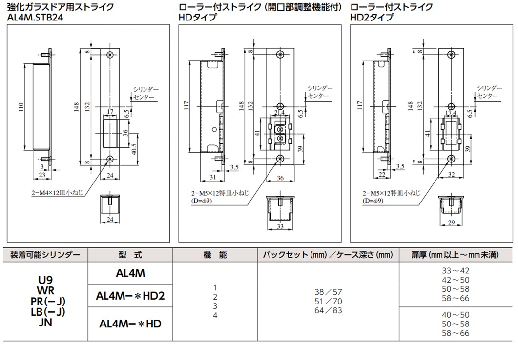 ・仕様バックセット(mm)38・51・64 ・ケース深さ(mm)57・70・83 ・扉厚可能範囲(mm以上∼mm未満)33∼42・42∼50・50∼58・58∼66 (注)AL4MーEの最小扉厚は34mm以上ですのでご注意願います。